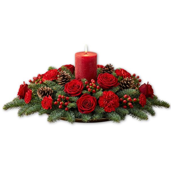 Questo centrotavola è un inno assoluto al colore del Natale per eccellenza: il rosso. Il nome trova la sua perfetta espressione nella grande candela rossa centrale, cuore pulsante della composizione, che svetta maestosa pronta ad accendersi per diffondere un bagliore caldo e intimo sulla tavola imbandita.