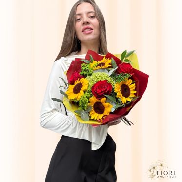 Passione è un mazzo di fiori intenso e affascinante con Rose rosse, Girasoli, verde riempitivo e con carta decorativa coordinata, perfetto per esprimere emozioni profonde.