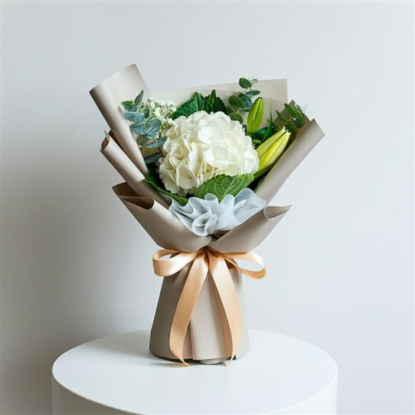 Un bouquet puro ed elegante, Anima Mia unisce ortensie e gigli bianchi, mentre nella versione grande si arricchisce con garofani e rose, creando una composizione raffinata perfetta per esprimere sentimenti sinceri.