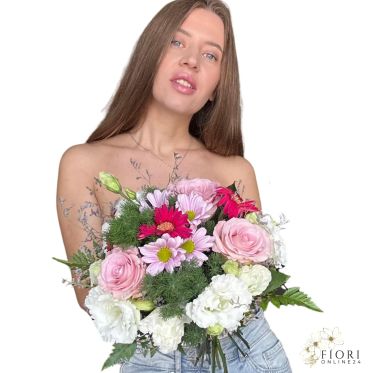 Bouquet raffinato con rose, gerbere, lisianthus e fiorellini di stagione, ideale per celebrare ogni momento speciale con eleganza.