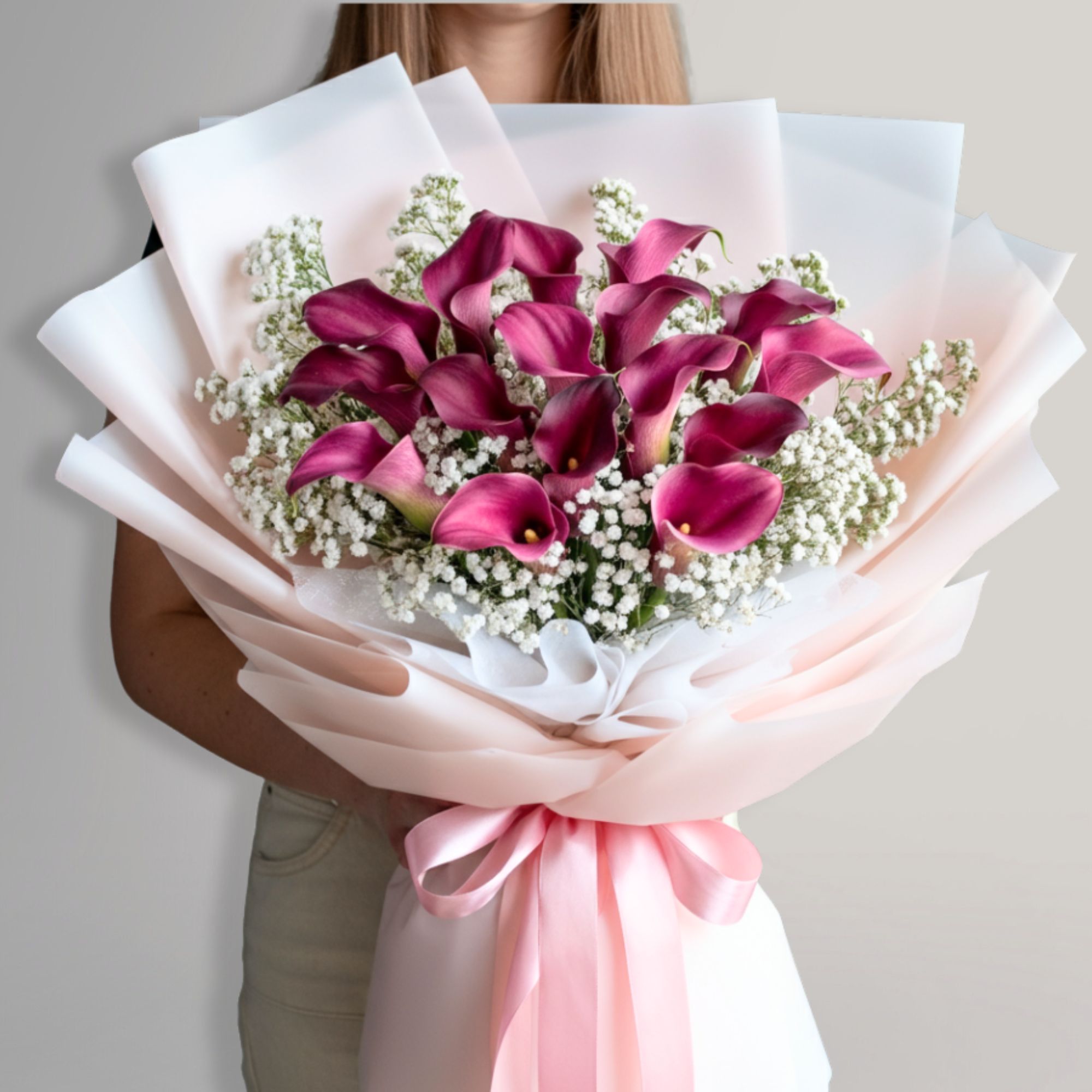 Con Tutto l’Amore che Posso è più di un mazzo di fiori, è una dichiarazione di sentimento. Questo bouquet incantevole combina la grazia delle calle rosa con la delicatezza di piccoli fiori bianchi decorativi, creando un’armonia perfetta che trasmette dolcezza e amore sincero.