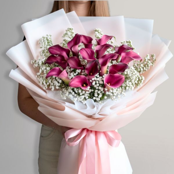 Con Tutto l’Amore che Posso è più di un mazzo di fiori, è una dichiarazione di sentimento. Questo bouquet incantevole combina la grazia delle calle rosa con la delicatezza di piccoli fiori bianchi decorativi, creando un’armonia perfetta che trasmette dolcezza e amore sincero.