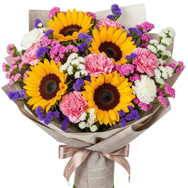 Il bouquet “Dimmi che ci sei” è un’esplosione di gioia e affetto. Con girasoli che simboleggiano ammirazione, statice per i sentimenti duraturi e garofani che esprimono amore profondo. È il modo perfetto per trasmettere vicinanza, felicità e un affetto incondizionato, per ogni occasione. Dimmi che ci sei, “io ci sono per te”