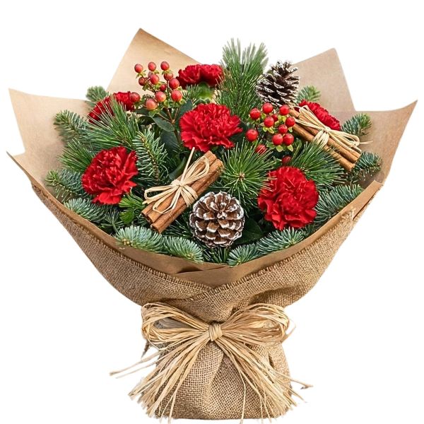 Dono di Vita: Un meraviglioso intreccio dove i garofani, bacche rosse, rami di pino, pigne e legnetti legati. Un bouquet che porta in casa l’energia pura e autentica della natura.