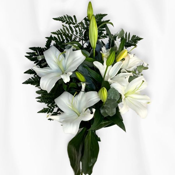 Mazzo Funebre con Lilium bianchi su base di verde decorativo – Scegli la dimensione del mazzo