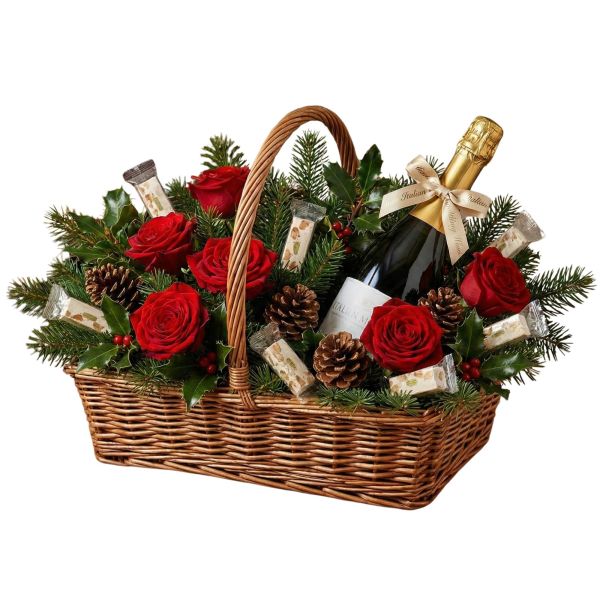 Gran Galà Natalizio: Un cesto di pura eleganza floreale con torroncini e spumante per un brindisi frizzante a celebrare il Natale con stile e gusto.