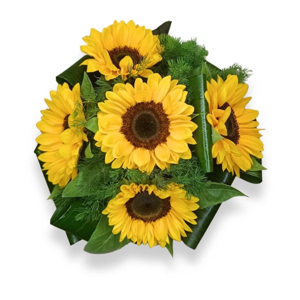 Bouquet di Girasoli con verde decorativo, perfetto per portare luce e allegria in ogni ambiente.