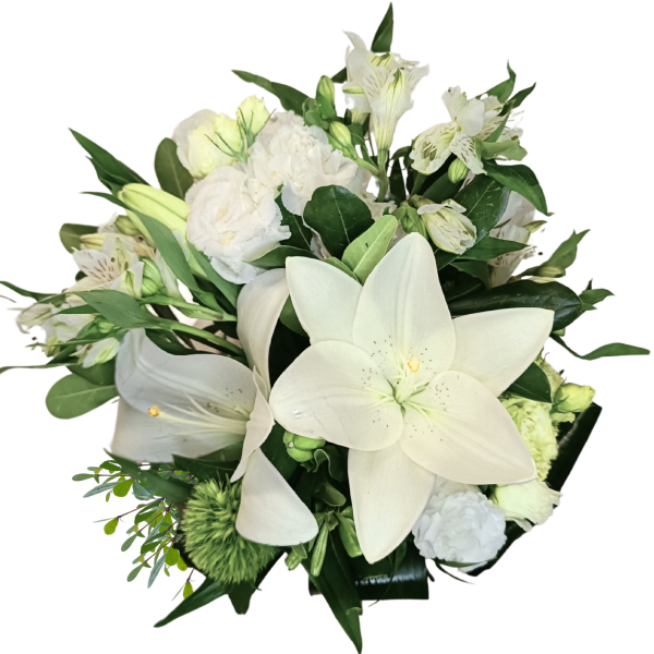 - Composizione: Gigli bianchi, Alstromerie, Lisianthus e verde di stagione.