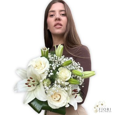 Nature è un bouquet incantevole con Rose bianche, Lilium, Gipsofila e verde, ideale da regalare per occasioni speciali, portando eleganza e raffinatezza ad ogni celebrazione.