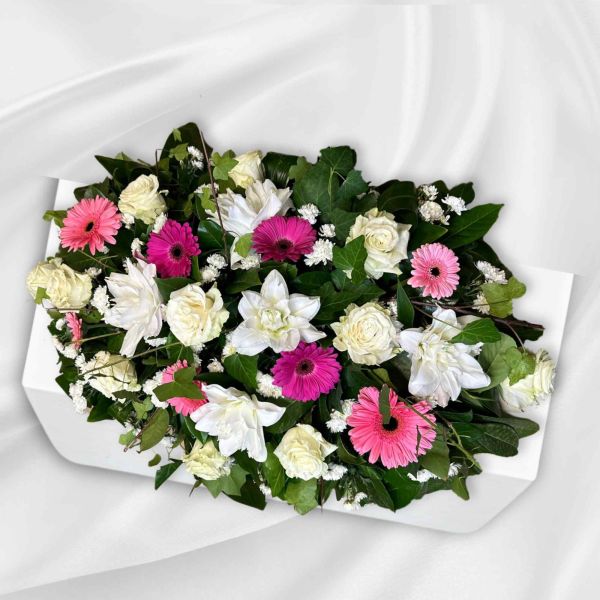 Cuscino funebre allungato con Rose, Lilium, Gerbere e fiori misti in delicate sfumature di rosa e bianco, per un omaggio commovente.