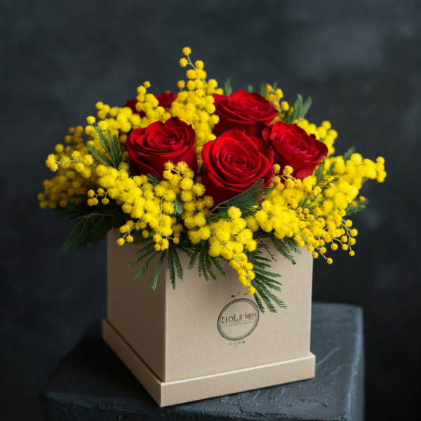 Ogni dettaglio della composizione è studiato con cura. Le mimose, con il loro aspetto soffice e radioso, incorniciano con delicatezza le eleganti rose dal colore vibrante. La scatola, elegante e raffinata, custodisce questo prezioso incontro floreale, arricchito da un tocco di verde che dona equilibrio e grazia.