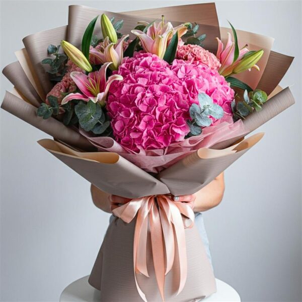 Un bouquet dal fascino senza tempo, pensato per raccontare le emozioni più profonde. I gigli rosa, simbolo di purezza e devozione, si uniscono alla delicatezza delle ortensie rosa, creando un gioco di colori e forme che incanta lo sguardo. Il verde decorativo aggiunge freschezza e armonia, completando un quadro di rara bellezza.
