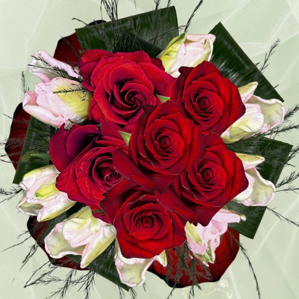 Bouquet con Rose rosse, Tulipani rosa, verde e dettagli decorativi. Un regalo romantico ed elegante per rendere ogni momento speciale e indimenticabile.