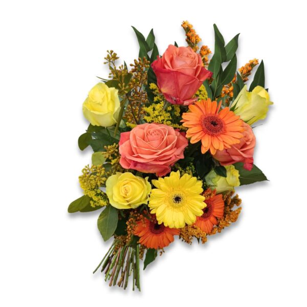- Composizione: Il mazzo è composto da una raffinata selezione di rose, gerbere e fiori stagionali nelle tonalità giallo e arancio.