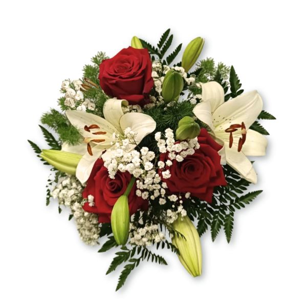 Rose rosse per passione, Lilium bianchi per purezza, fiorellini per freschezza e verde decorativo per equilibrio naturale ed eleganza.