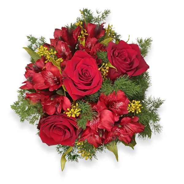- Composizione floreale: Rose rosse, alstroemerie rosse e verde decorativo.