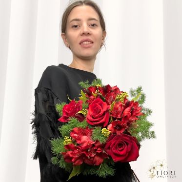 • Composizione floreale: Rose rosse, alstroemerie rosse e verde decorativo.