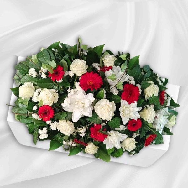 Scarlett è un elegante cuscino funebre allungato, con Rose , lilium e fiori misti in bianco e rosso per un omaggio raffinato.