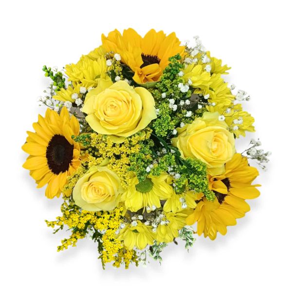 Bouquet luminoso con rose, girasoli e fiori misti gialli e bianchi, perfetto per portare gioia e vitalità in ogni ambiente con un tocco solare.