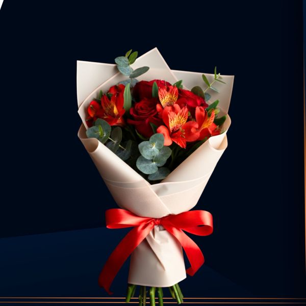 - Composizione floreale: Alstroemerie e rose rosse, selezionate per freschezza e bellezza.