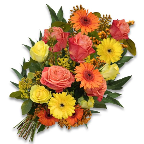 • Composizione: Il mazzo è composto da una raffinata selezione di rose, gerbere e fiori stagionali nelle tonalità giallo e arancio.