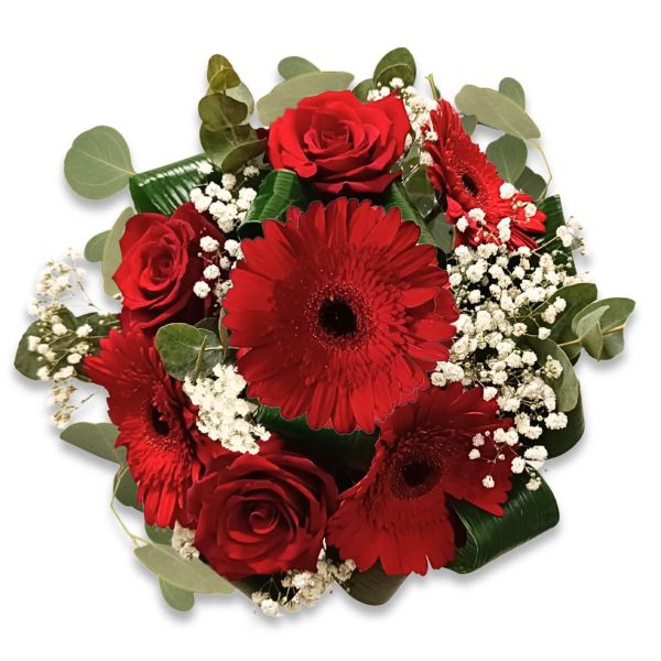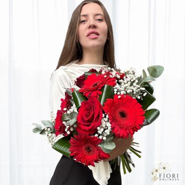 - Composizione floreale: Rose rosse, gerbere rosse, gypsophila e verde decorativo.