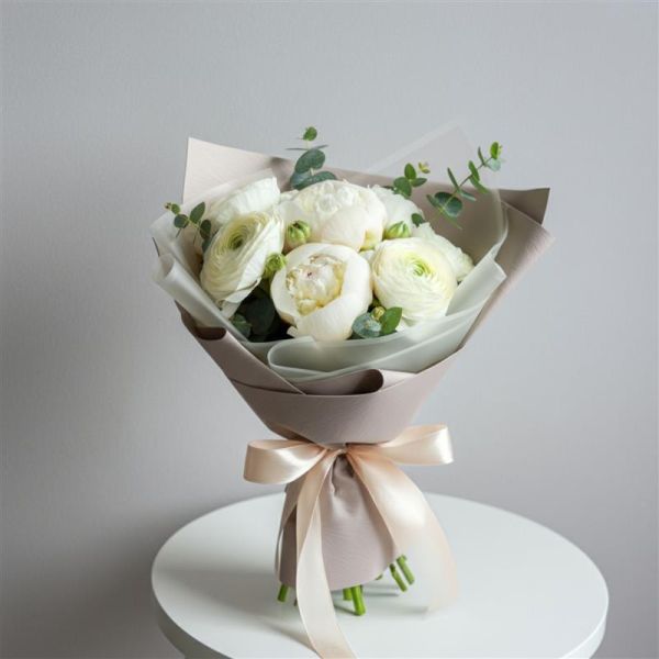 Un bouquet che racchiude in sé l’essenza della purezza e dell’eternità. Le peonie bianche, simbolo di amore sincero e nobiltà d’animo, si uniscono all’eleganza sognante dei ranuncoli bianchi, dando vita a una composizione di straordinaria leggerezza e raffinatezza. Ogni fiore è un sussurro, un messaggio che parla di sentimenti profondi e promesse senza tempo.