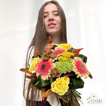 Bouquet con rose e gerbere arancioni, tonalità calde di arancione e giallo, design elegante e vibrante, ideale per ogni occasione, con freschezza duratura.