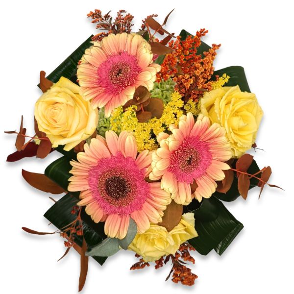 - Composizione unica: Rose arancioni e gerbere in tonalità calde di arancione e giallo.
