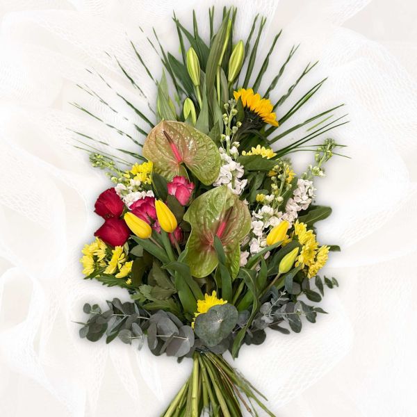 Mazzo funebre composto da Anthurium, Rose, Tulipani e fiori misti con verde decorativo